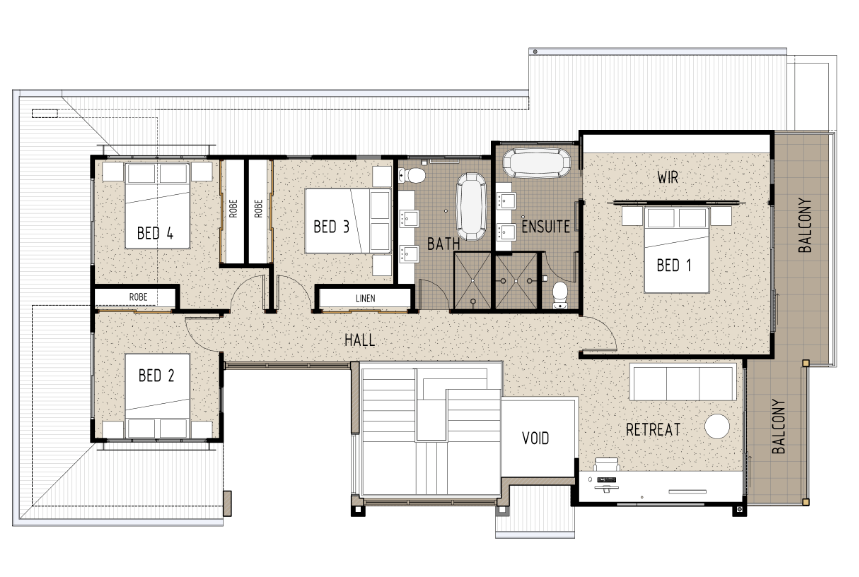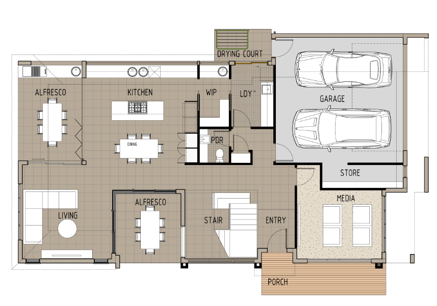 This gorgeous modern house design ticks all the boxes while still managing to keep to an affordable size. Entering the home on the left side you will walk into an entrance/foyer area with a dedicated media room to your right and the staircase to your left. Straight ahead you will find a powder room and separate laundry. Heading into the home, the remainder of the ground floor is made up of an open plan kitchen, dining and living area which is broken up with a central outside alfresco - glass sliding door access from both the dining area and the living room. A second outside alfresco leads off from the kitchen and features an outside kitchen and bi-fold doors which when open, turn the kitchen and alfresco into one large living space. The kitchen itself is a large and modern design and features an island bench, walk in butlers pantry and additional storage options. Heading up to the first floor, there are three bedrooms with built in robes, the main family bathroom and a separate retreat room which could be used as another living room, study or guest bedroom. The master bedroom is at the front of the home and includes features such as a full length walk in robe, large luxury private ensuite and private access to the front balcony.