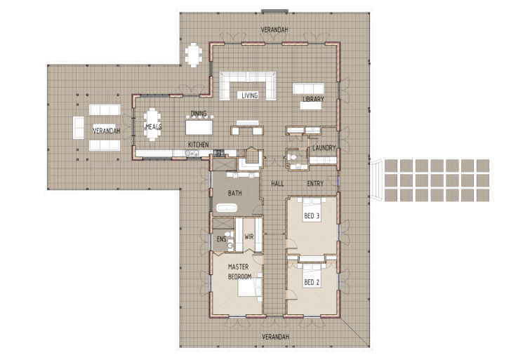 This three bedroom homestead style floor plan will suit clients looking for that country home or acreage homestead. The entire home is surrounded by a gorgeous verandah which is extended at the rear of the home into a large entertainment area. Every room and walkway of the home has access to the verandah via double french doors which really adds to the country feel of the home. This floor plan features three bedrooms, two with built in wardrobes and the master with a walk in wardrobe and private ensuite. The main family bathroom is a very spacious design and features room for a stunning clawfoot bath. The kitchen, dining and living room is a large open plan design. The kitchen features an island bench and small walk in pantry. The living room is large enough to actually be two living areas and used as a space such as a library as suggested by our plan.